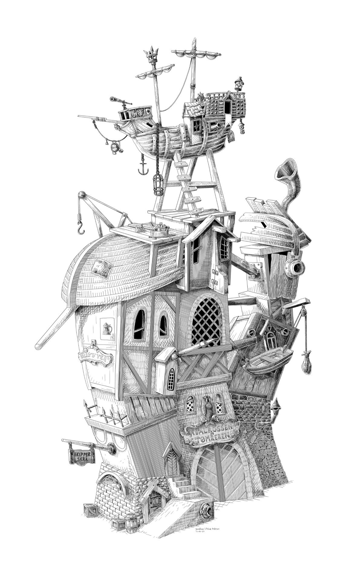 Forside-, bagside- og kapiteltegninger til HPR skolens jubilæumsbog